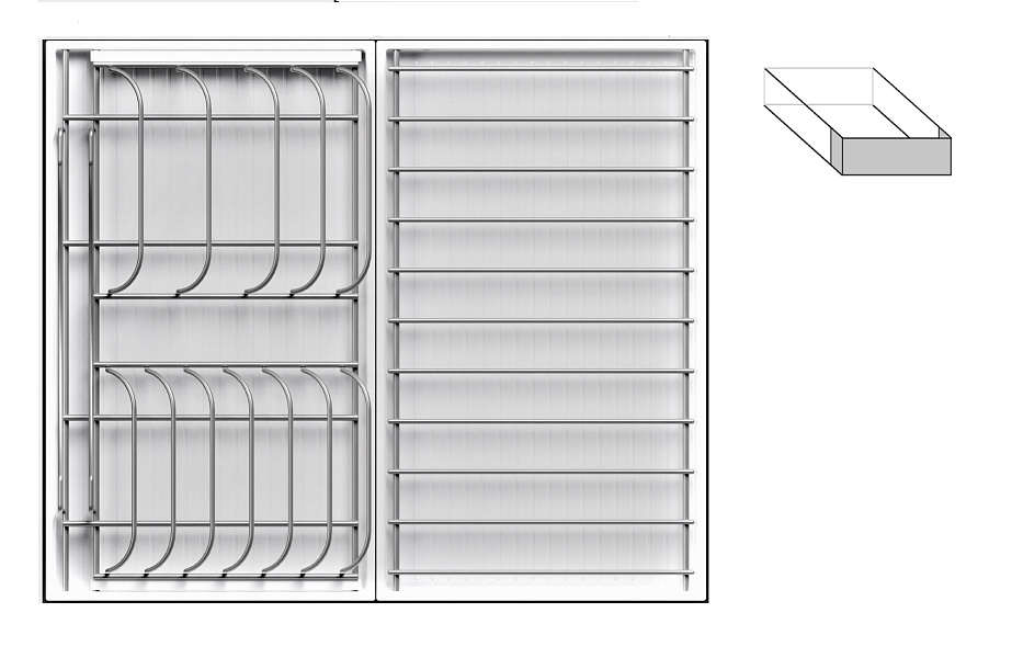 - 1 большой модуль для посуды + 1 большой модуль с решеткой + 1 малый модуль для посуды + модуль для столовых приборов