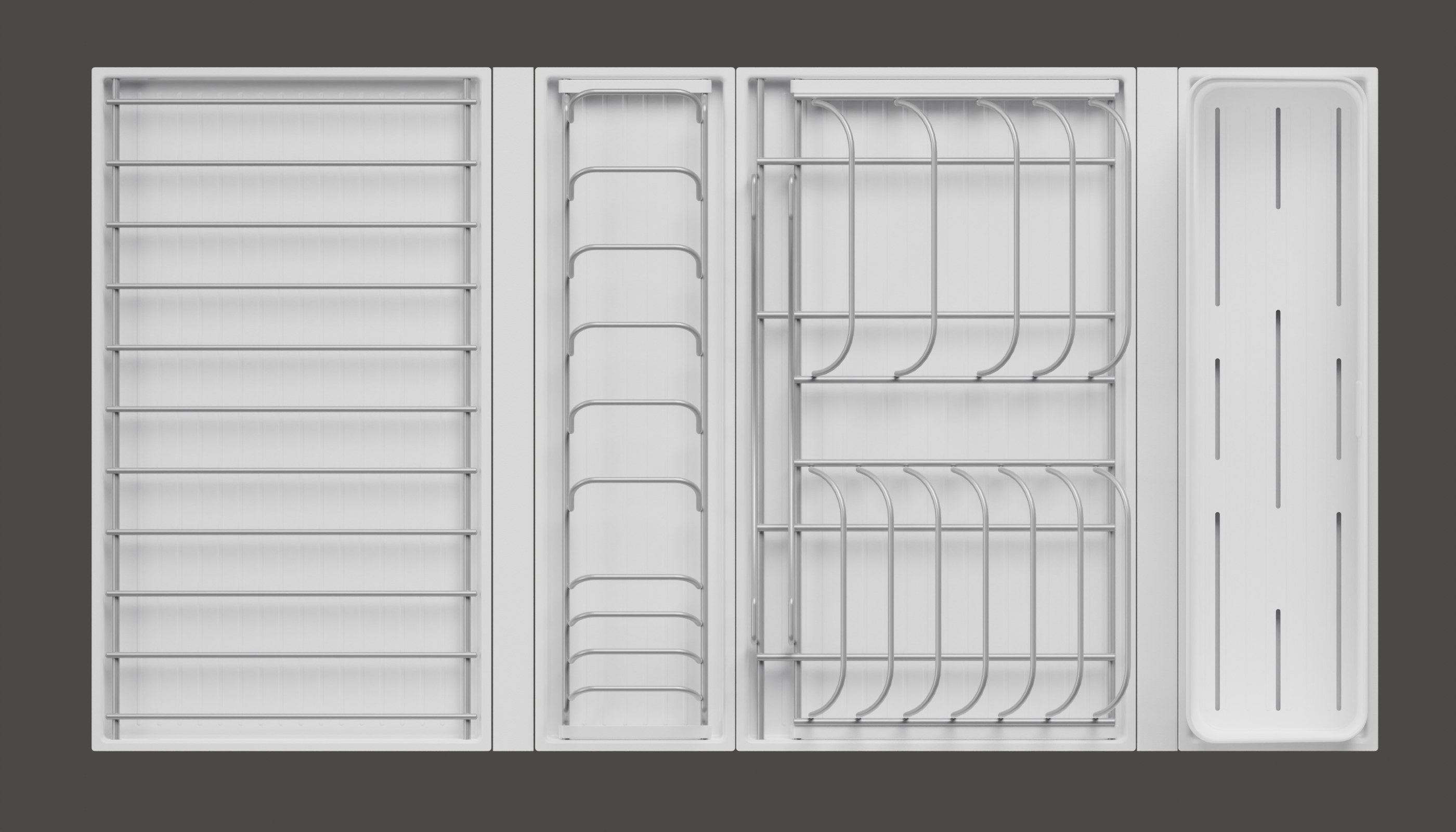 Модель — 1 большой модуль для посуды + 1 большой модуль с решеткой + 1 малый модуль для посуды + модуль для столовых приборов