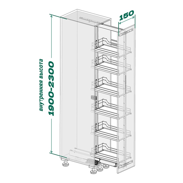 • Высокая нагрузка на механизм в 100 кг (по 18 кг на полку) позволяет организовать хранение большому количеству предметов, при этом даже при полной загрузке система выдвигается легко.