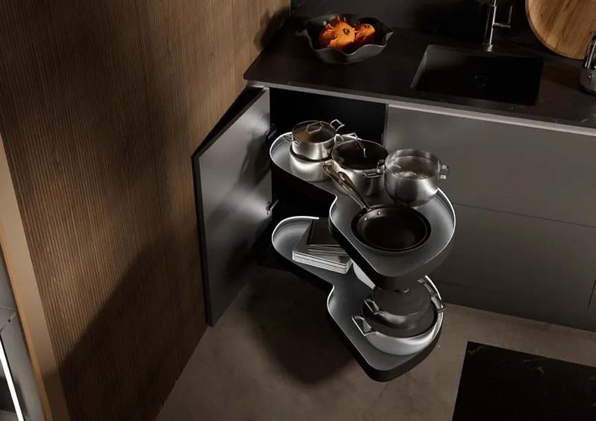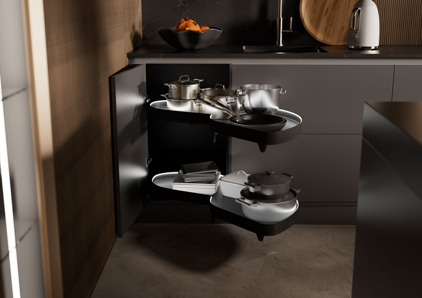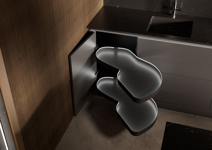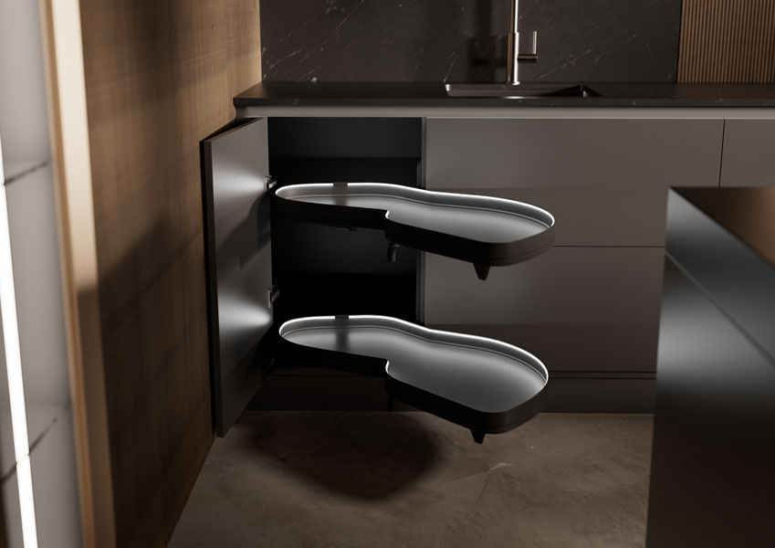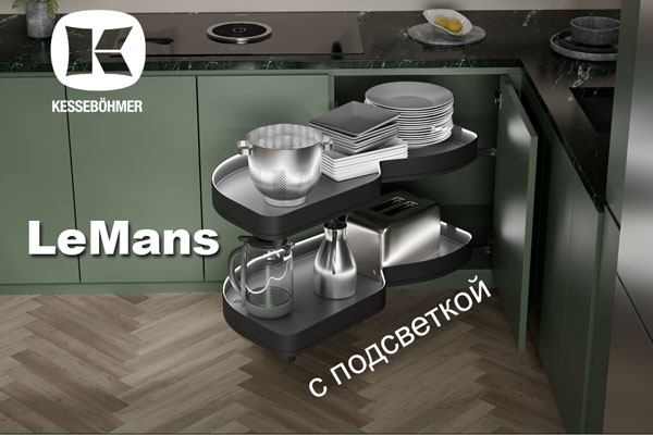 Что может быть лучше механизма Kesseböhmer для угловых тумб LeMans? Только новинка – LeMans с подсветкой, представленная на выставке комплектующих, фурнитуры, материалов для производства мебели Interzum 2025 в Германии.