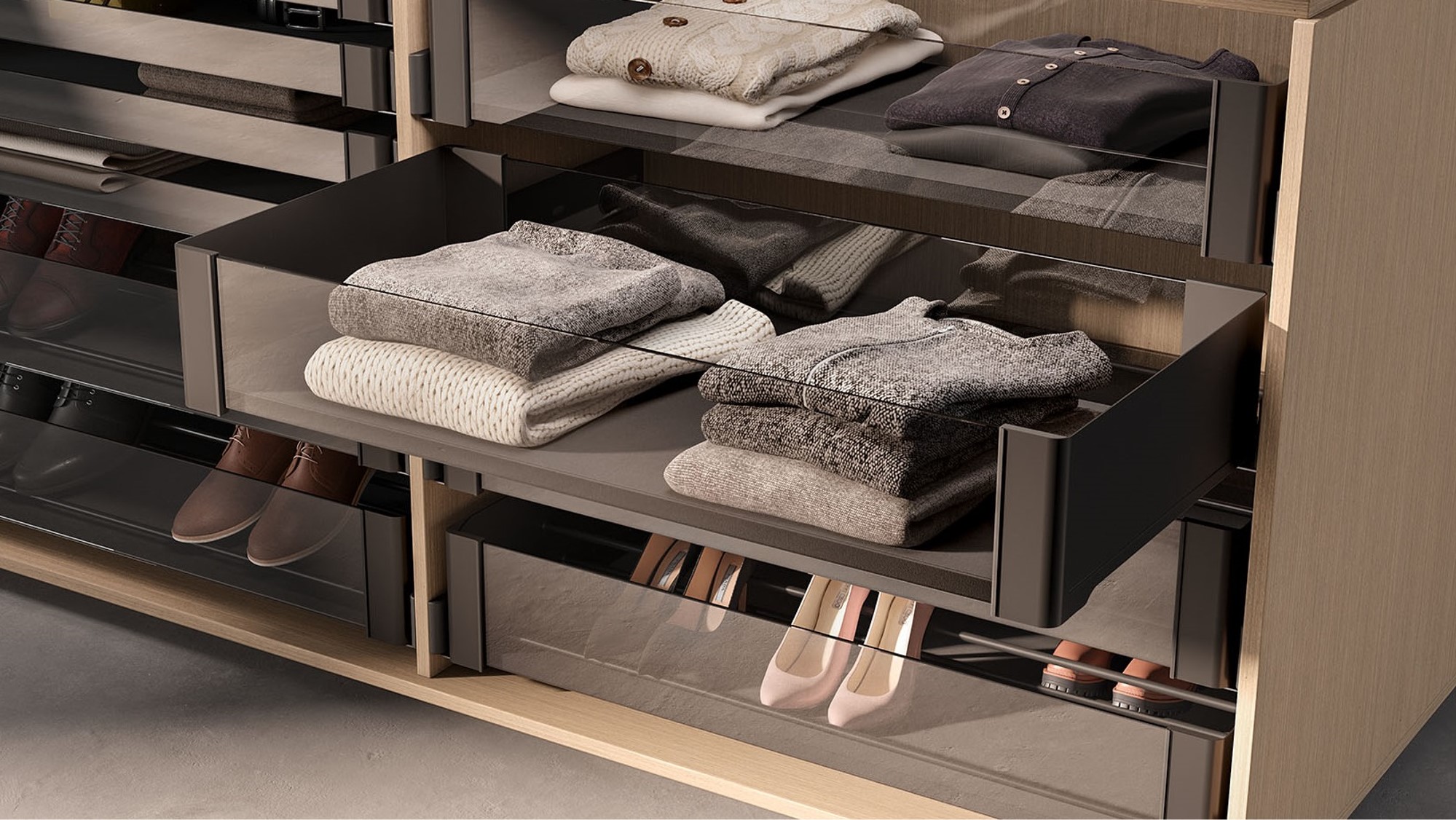 Система хранения Конеро от Kesseböhmer — комплексное решение, которое включает в себя все, что нужно для создания функциональных гардеробных и шкафов-купе: полки, пантографы, штанги, брючницы, держатели для ремней и галстуков, а также наполнение для хранения ювелирных изделий.